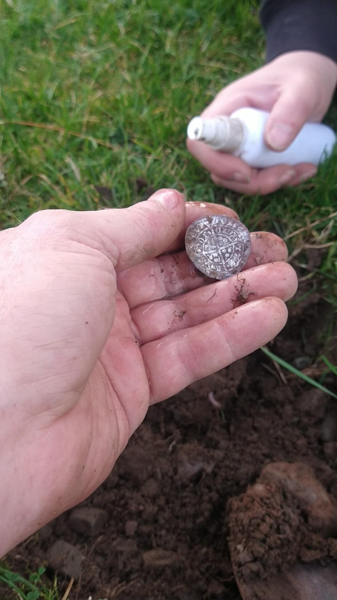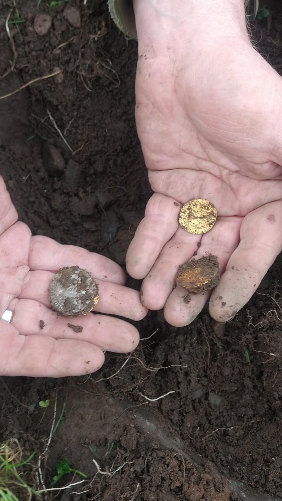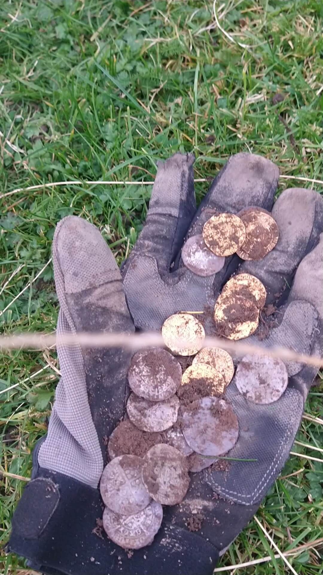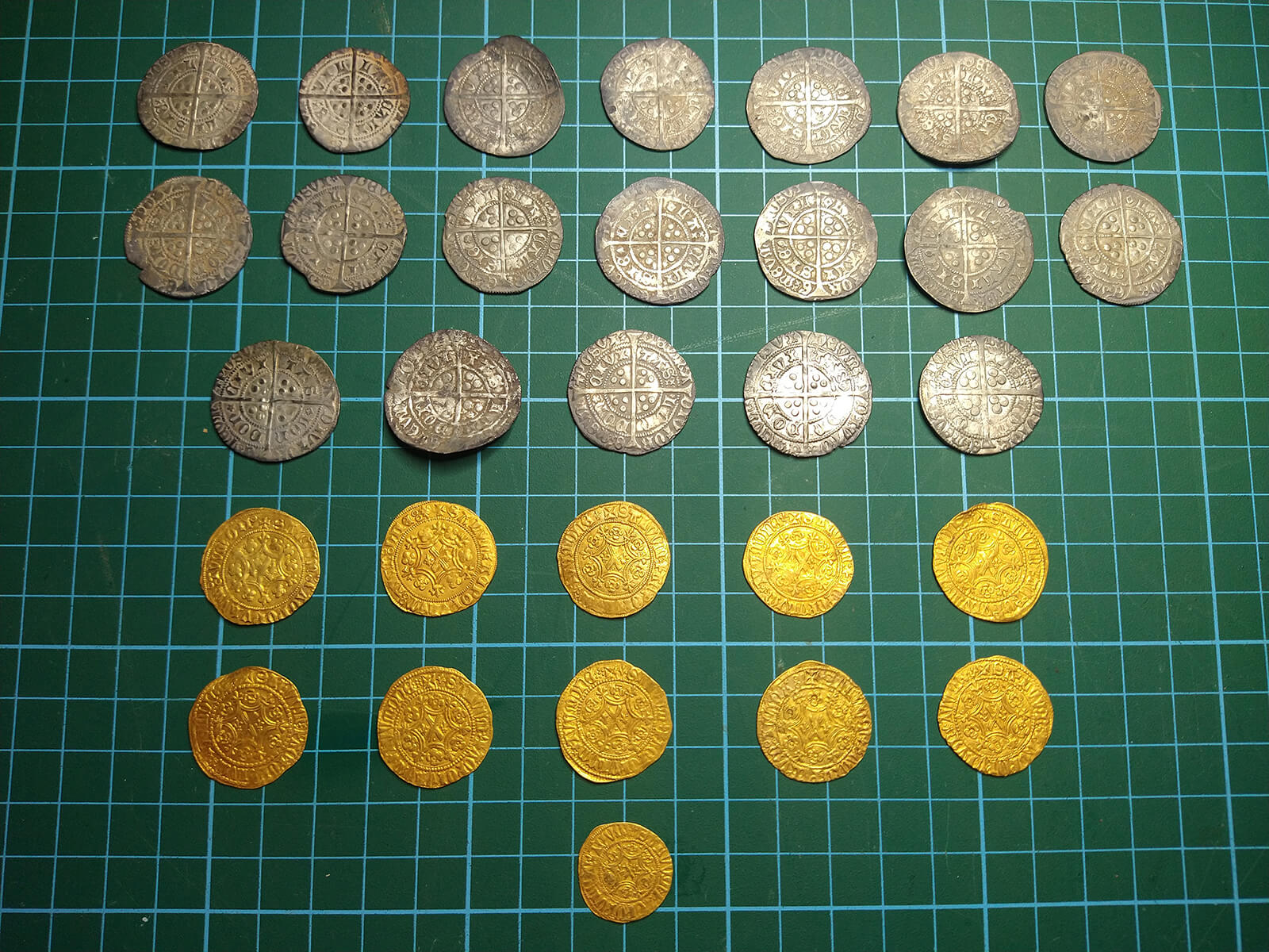 30 gold and silver hammered coins Lisa and Keith initially recovered from the Cappercleuch hoard. In total 35 coins were recovered following a full excavation of the site. The coins comprise of 23 English silver goats of Henry V to Edward IV, and 11 gold demys and 1 gold half demy of James I & James II.